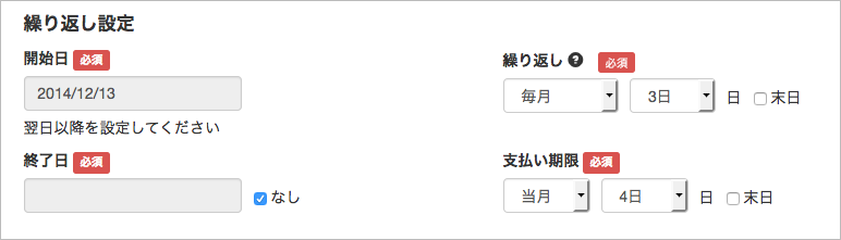 繰り返し請求は「開始日」から「終了日」の間の期間で実行されます。